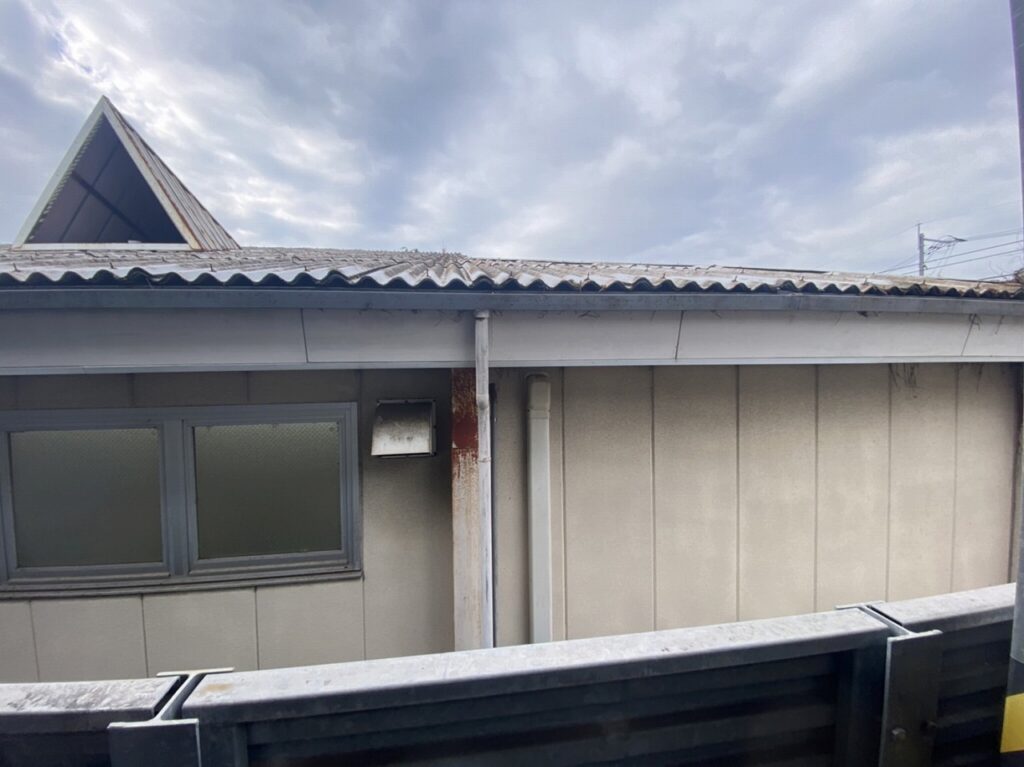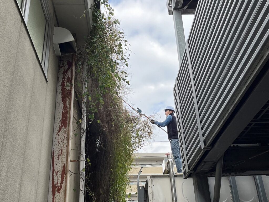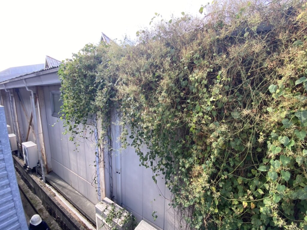 換気のフードや樋など、意外と出っぱりもあるので、建物を傷付けないよう作業します。